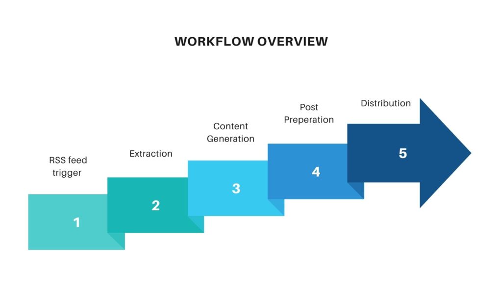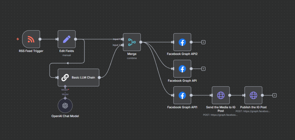 The workflow continuously monitors the website RSS feed for new articles. Once a new article detected, it retrieves the it, extracts essential fields like title, description, and image, and generates a fresh caption with hashtags using GPT-3.5 turbo. Finally the system posts the content to multiple Facebook pages and Instagram accounts using the Meta Graph API.